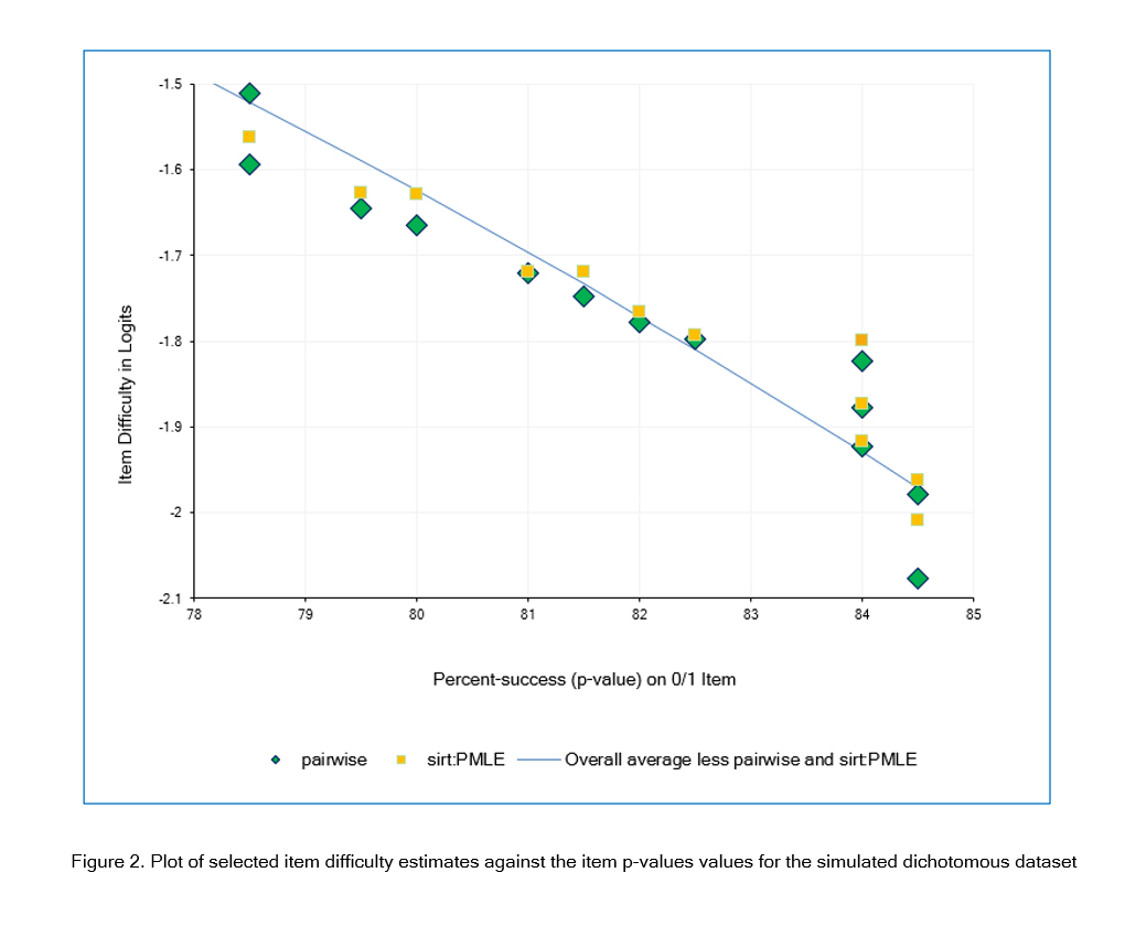 Most item estimates were less than .01 logits away from the corresponding overall average estimates. However, some of the estimates made by sirt:PMLE and pairwise were more than 0.1 logits away from the overall average, as shown in Figure 2. Also, for each of these two estimators, some items with the same p-value (x-axis) have different logit estimates (y-axis), as shown by the same icon appearing more than once in a vertical column in Figure 2. This is a feature of PMLE (Pairwise maximum Likelihood Estimation) but is contrary to the general Rasch principle that “the same total score by the same persons (no missing data) produces the same item difficulty, regardless of the items' response patterns.”