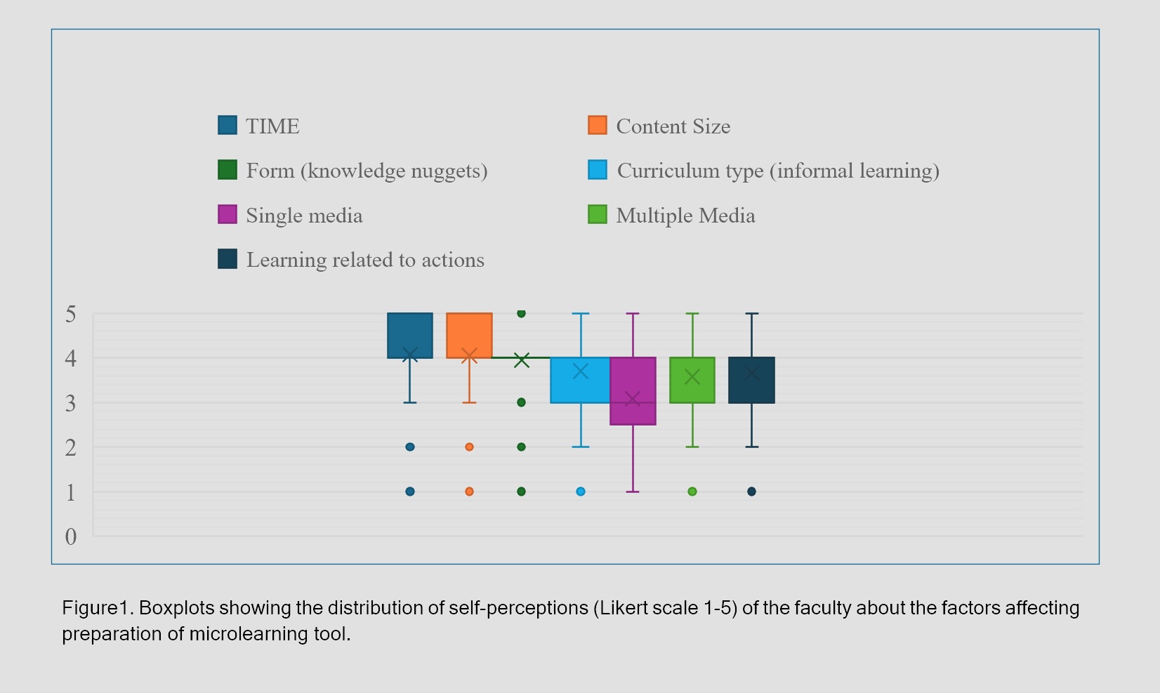 The quantitative study highlighted time (duration), content size, form (knowledge nuggets), curriculum type, learning related to actions and media (single and multiple) as predominant factors affecting the preparation of the microlearning tool (Figure 1). The higher median of time (duration) and content size indicated that most respondents believed these two factors would play a principal role in the preparation of a microlearning tool. With a less varied distribution of perceptions, the form of the topic (knowledge nuggets) would also play a significant role. The distribution of perceptions regarding informal curriculum, media type, and learning related to actions indicated that these factors would play a less significant role in the preparation of a microlearning tool.