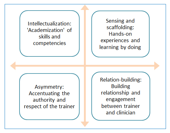 Despite the abovementioned constraints the study showed that the pedagogical investments and teaching methods of expert trainers were able to initiate learning, when they in addition to pure technical training also focused on affecting the clinicians’ logic of practice and illusio within the training context. Thereby they focused on developing a deeply felt sense of ‘buy-in’ in the clinicians to the way of scoping promoted and exemplified by the trainers. As illustrated in Figure 1, the multi-dimensional approach of the expert trainers for creating buy-in among the clinicians, this theme represents the interrelationship between four of the most frequently occurring codes in the data material, and thus the four most current and observable pedagogical investments and teaching methods among the trainers.
